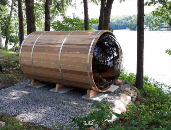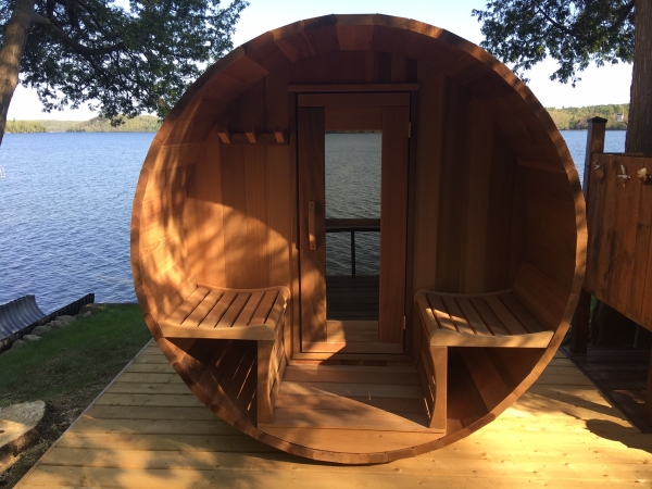 We are very exited to introduce all NEW Premium Panoramic View Clear Western Red Cedar Barrel Sauna. This sauna comes with an acrylic bubble back wall that allows you to see the beautiful view of you lake or landscape from inside the sauna. This unique sauna feels spacious and the views just add to the relaxing feeling when in the sauna.