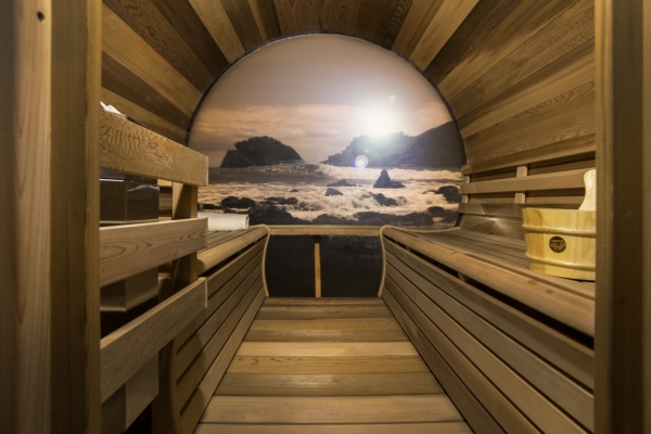 This unit comes with the choice of a 9 kW electric heater or Harvia wood burning sauna heater. Clear cedar benches on the inside can be used for a lying down or sitting up position.